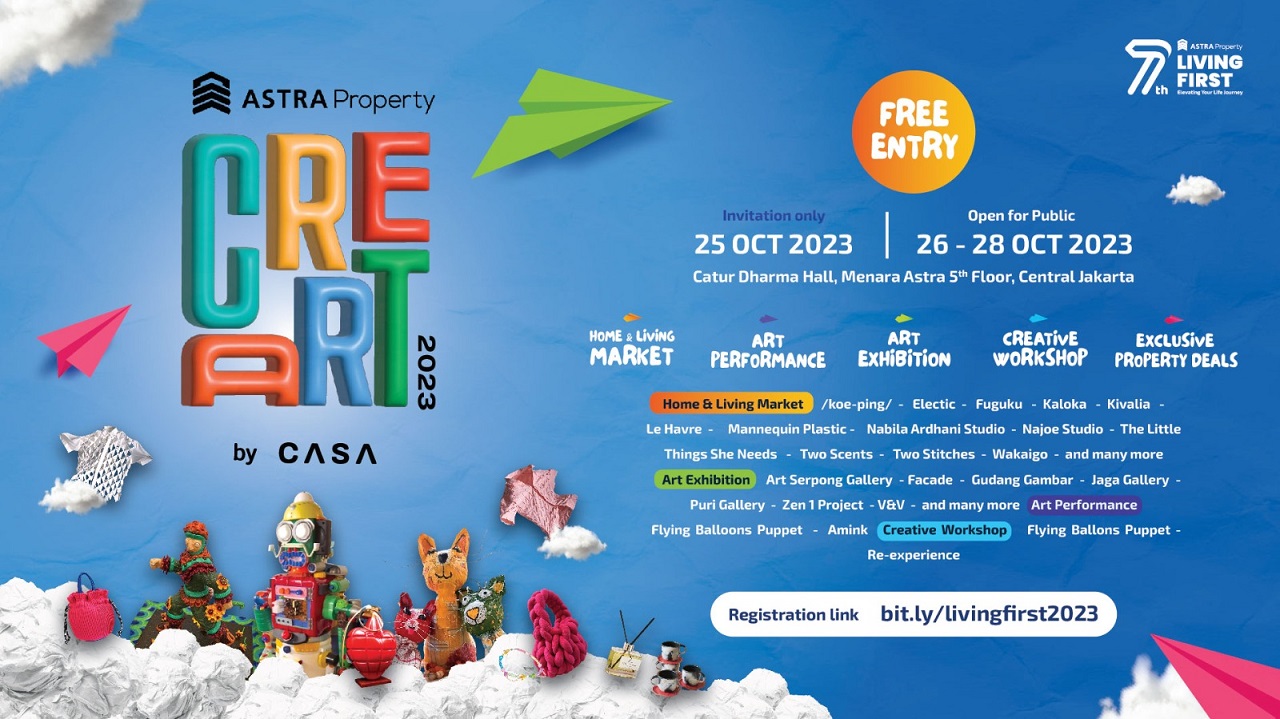Dalam rangka merayakan ulang tahunnya yang ketujuh, Astra Property kembali menggelar acara dan aktivitas berisi seni, yakni “Living First-CreArt 2023.” Mengambil tema “Elevating Your Life Journey” acara yang diselenggarakan bersama CASA by MRA Media ini berlangsung pada 25-28 Oktober 2023 di Catur Darma Hall, Menara Astra, Jakarta.