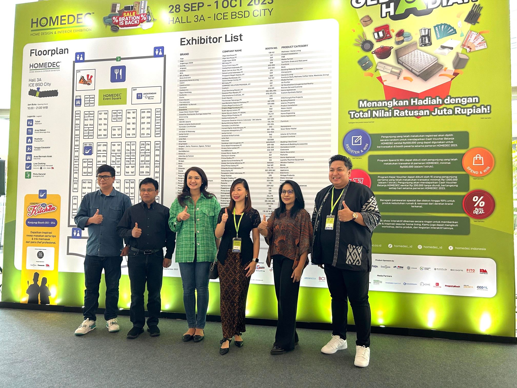 Sukses dilaksanakan selama 4 hari, 28 September – 1 Oktober 2023, HOMEDEC ditargetkan bisa mendatangkan pengunjung sebanyak 25.000 orang. Berbagai kategori produk dari brand berkualitas hadir di sini, di antaranya kitchen cabinet, flooring, home appliances, furnitur dan soft furnishing, mattress, jasa konsultasi interior desain, produk dekorasi rumah, dan lainnya.