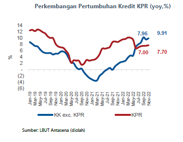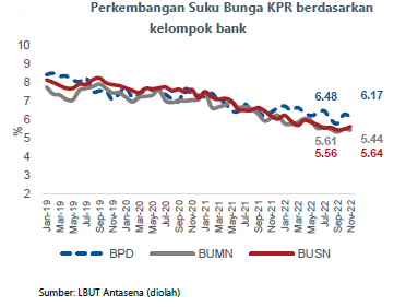 Sebaliknya, untuk jenis KPR, secara umum suku bunga kredit baru masih berada dalam tren menurun. Suku bunga kredit baru KPR pada November 2022 tercatat sebesar 5,56%, lebih rendah dari periode sebelum kenaikan BI7DRR (Juli 2022) sebesar 5,61%, atau mencatat penurunan sebesar 5 bps. Respons suku bunga KPR terhadap BI7DRR yang terbatas ditengarai merupakan upaya bank untuk mendorong pertumbuhan KPR yang sempat melambat di Triwulan II-2022.